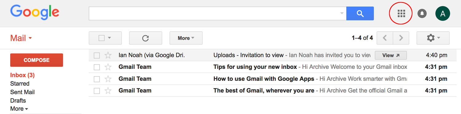 Click on the 9 dot icon at the top right of the page (circled in red on the image above). This will take you to Google Drive.