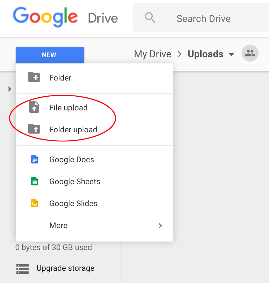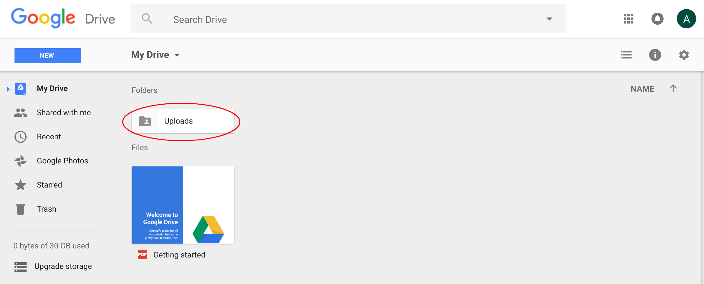 When in Google Drive, double click on the ‘Uploads’ folder (circled in red on the image above).
