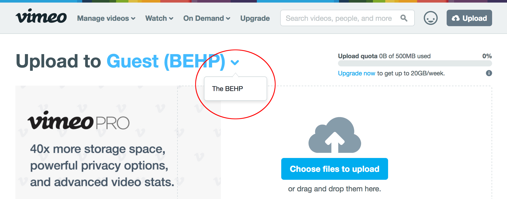 3. Switch accounts from Guest (BEHP) to The BEHP (click on the down arrow at the end of ‘Upload to Guest (BEHP) and select The BEHP from the drop down menu – shown circled in red).